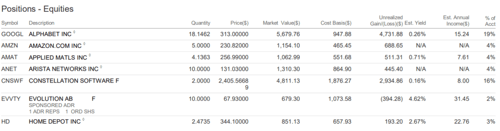 HD and GOOGL- I trimmed my holdings in Home Depot and Google. Not to much to write about this, I needed to free up some capital to buy Taiwan Semi and something had to go.